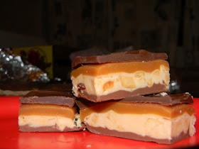 Melt ingredients in either saucepan or microwave then pour over the caramel layer and spread even. Let cool and harden completely.